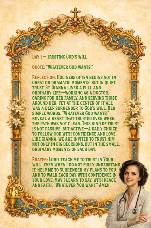 Discover the beauty of holiness in ordinary life with one of the Church’s most inspiring modern saints. In this 30-day devotional, walk with St. Gianna Molla through reflections rooted in her witness of love, family life, and generous self-giving.