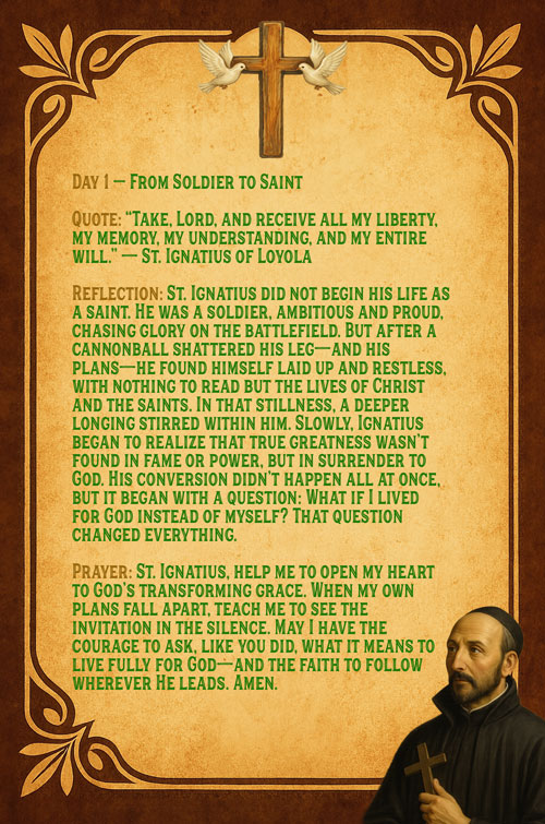 Prayer: Lord, through the guidance of St. Ignatius, help me to see with Your eyes, choose with wisdom, and live with bold faith. Make me a servant of Your greater glory.