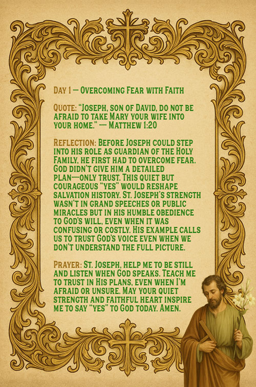 Prayer: Lord, through the example of St. Joseph, help me to trust Your plans even when I don’t understand them. Teach me to act with courage, lead with love, and listen with a quiet heart.