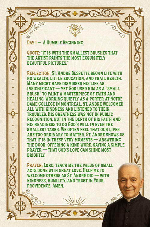 This 30-day devotional on St. André Bessette offers encouragement to trust God’s providence, welcome others with compassion, and live faith quietly yet powerfully. Whether you’re seeking healing, encouragement in weakness, or a renewed sense of purpose, this journey with a friend of the struggling soul will inspire you.